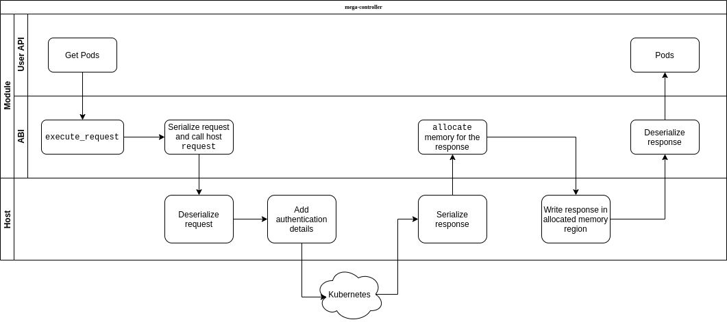 is the function to perform a blocking and buffered HTTP request, while all the other imports come from WASI. The user interacts with our hacked version of the Kubernetes client, which under the hood invokes request